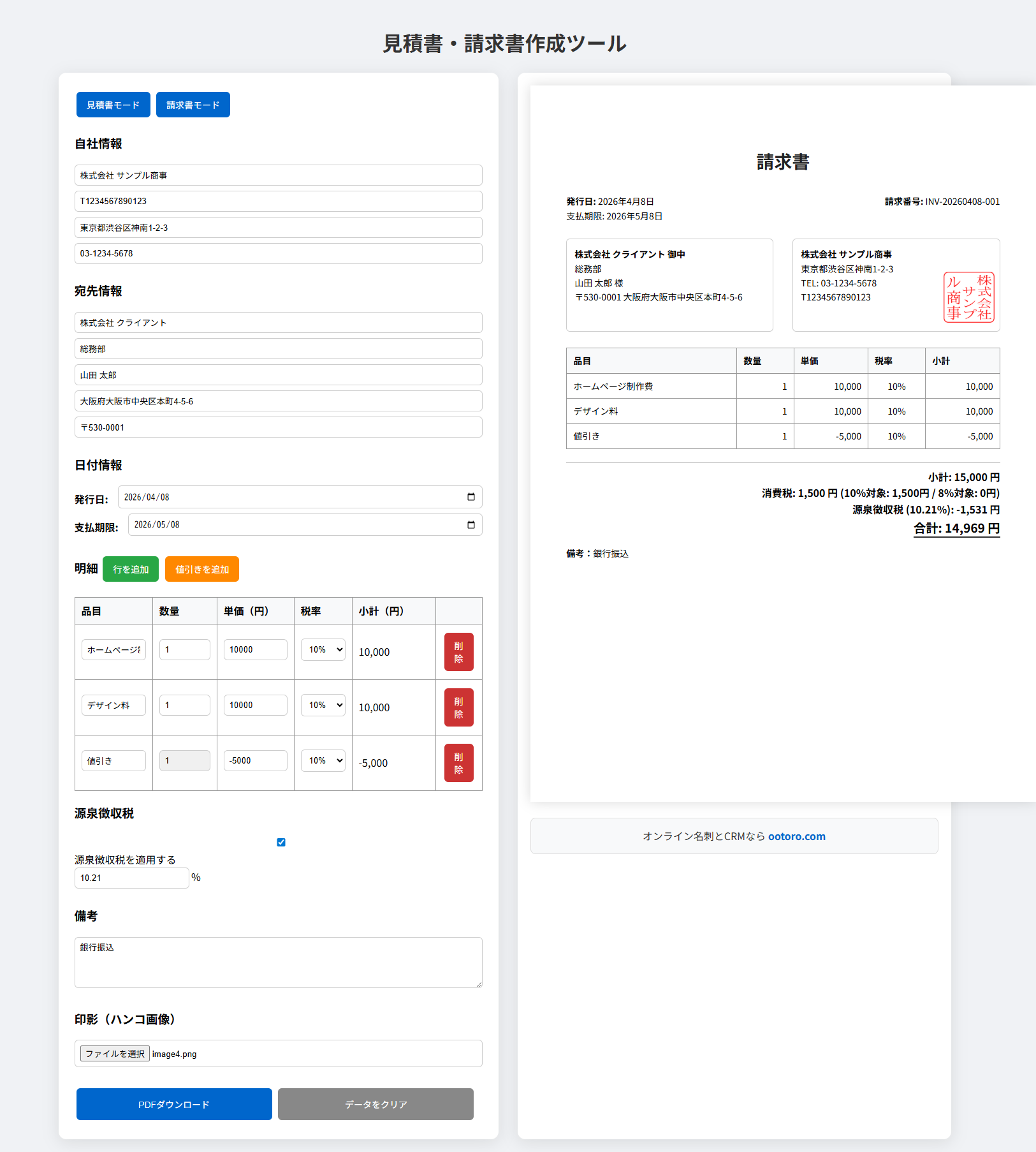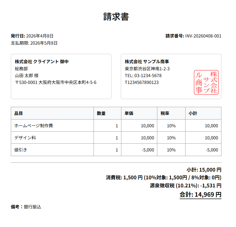 ・請求書モードで「源泉徴収税自動計算」対応